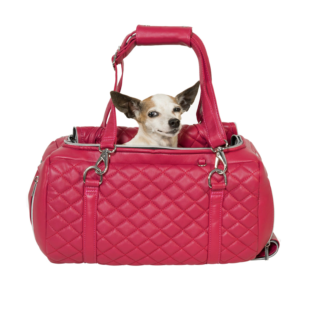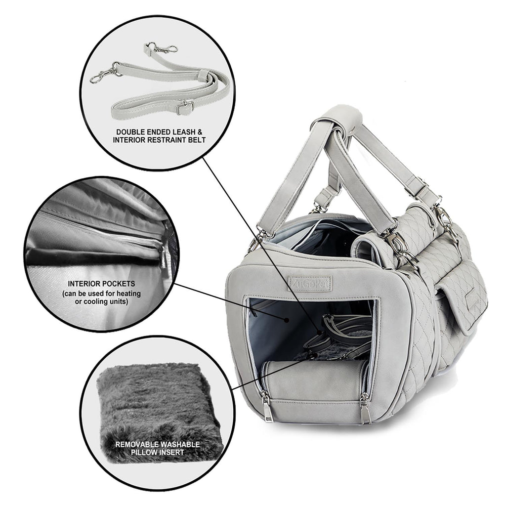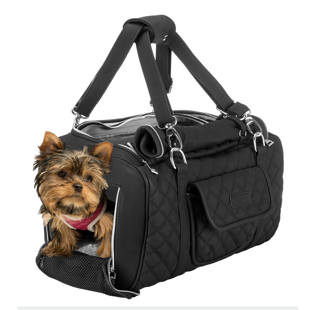 Our one of a kind pet carrier is a pet car seat, hands free walking leash, has an interior detachable walking leash, pet bed for small dogs or cats, airline approved carrier for small dogs, high fashion designer bag, waterproof and is vegan friendly.